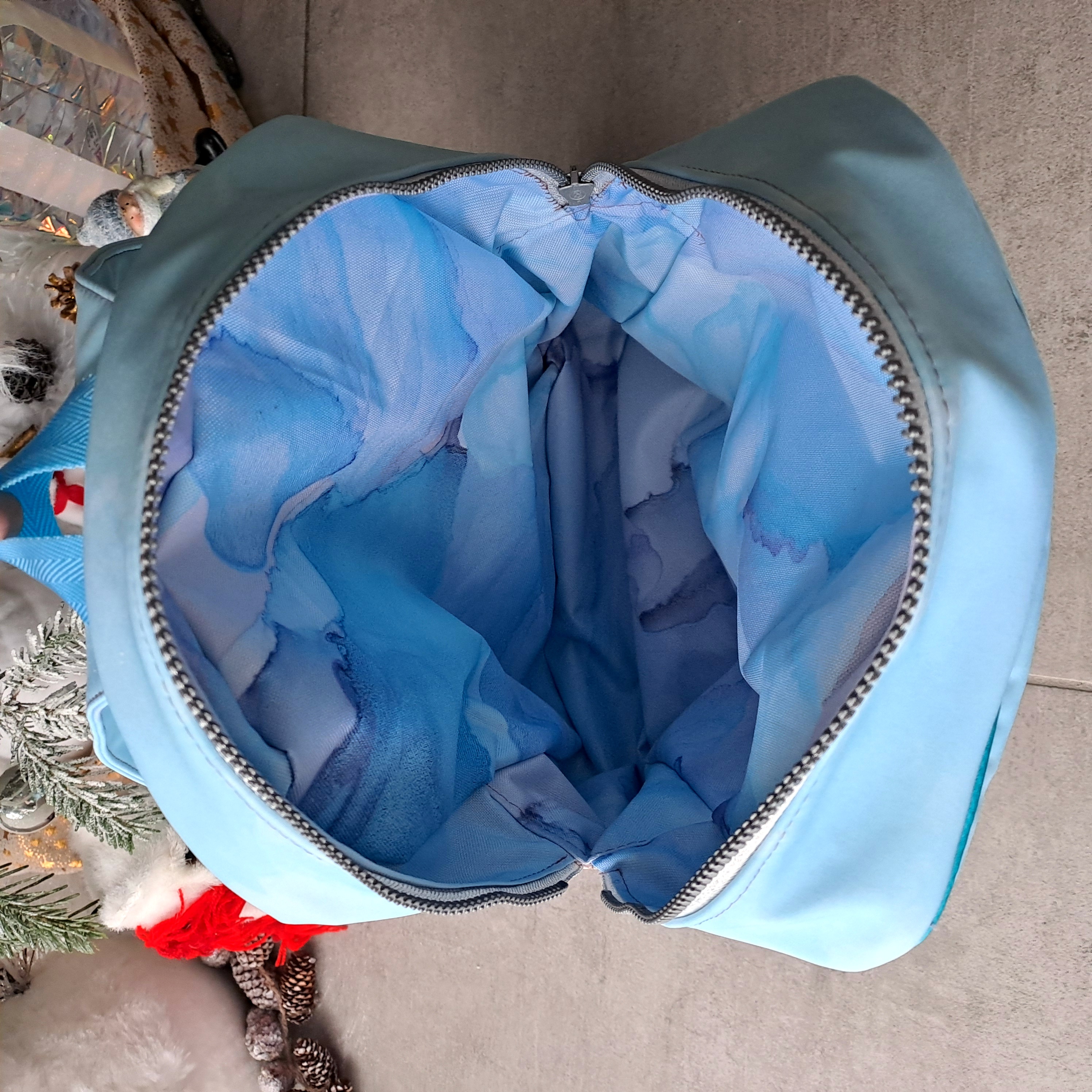 ✦ Ouvrez la fermeture éclair… Une doublure aquarelle bleue aux nuances profondes — comme si l’on plongeait dans les eaux de la sirène elle-même. Imperméable, elle protège avec soin cahiers, trousse et doudou des petits aléas du quotidien.
