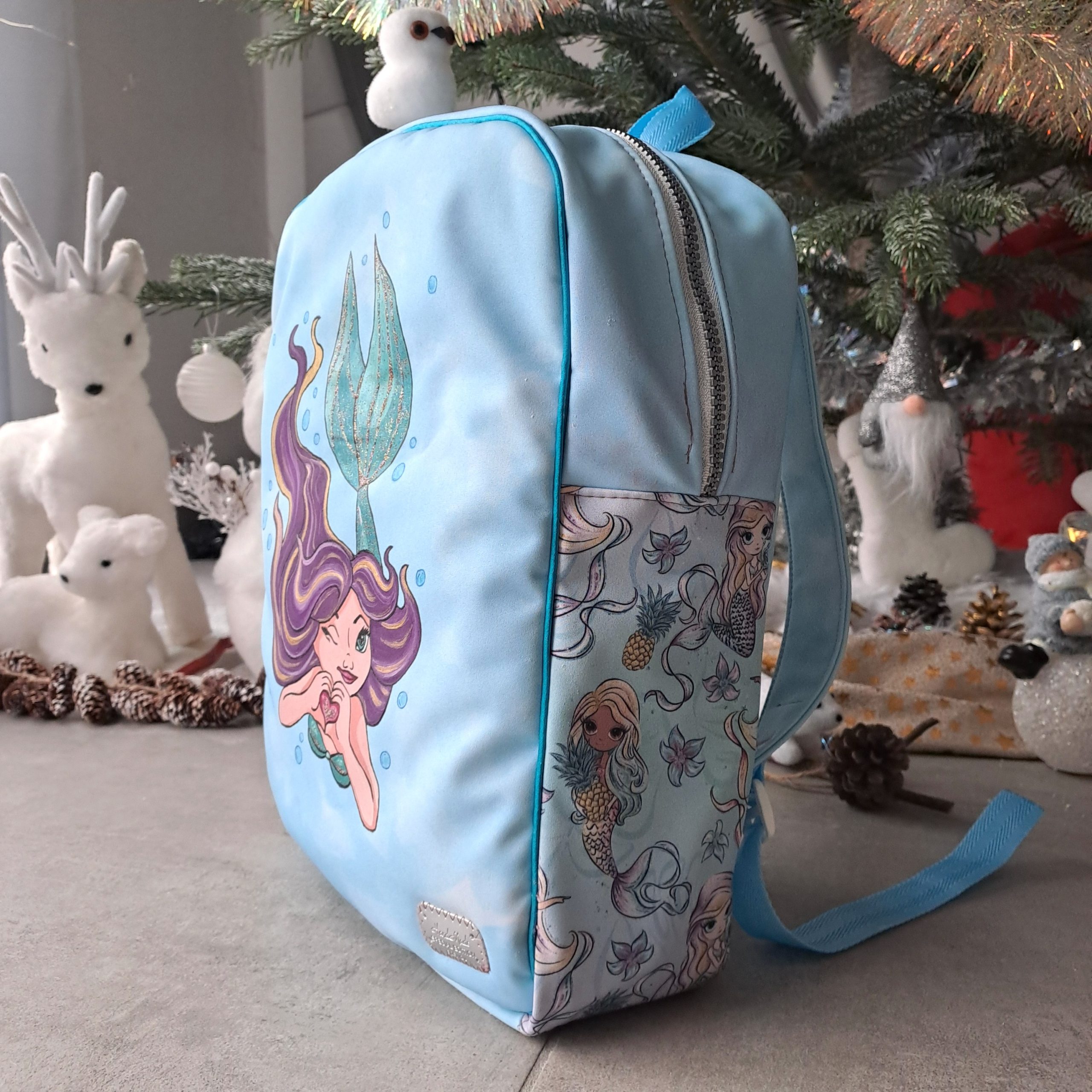 • Tissu imprimé sirènes et ananas pastel appliqué sur le côté — un clin d’œil à l’univers du sac, pour un effet décoratif qui prolonge la magie de l’illustration