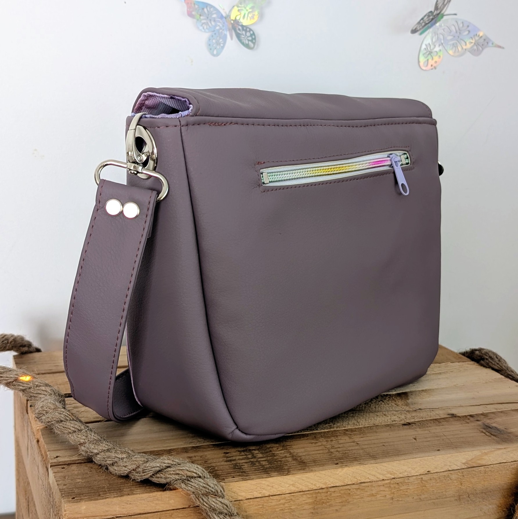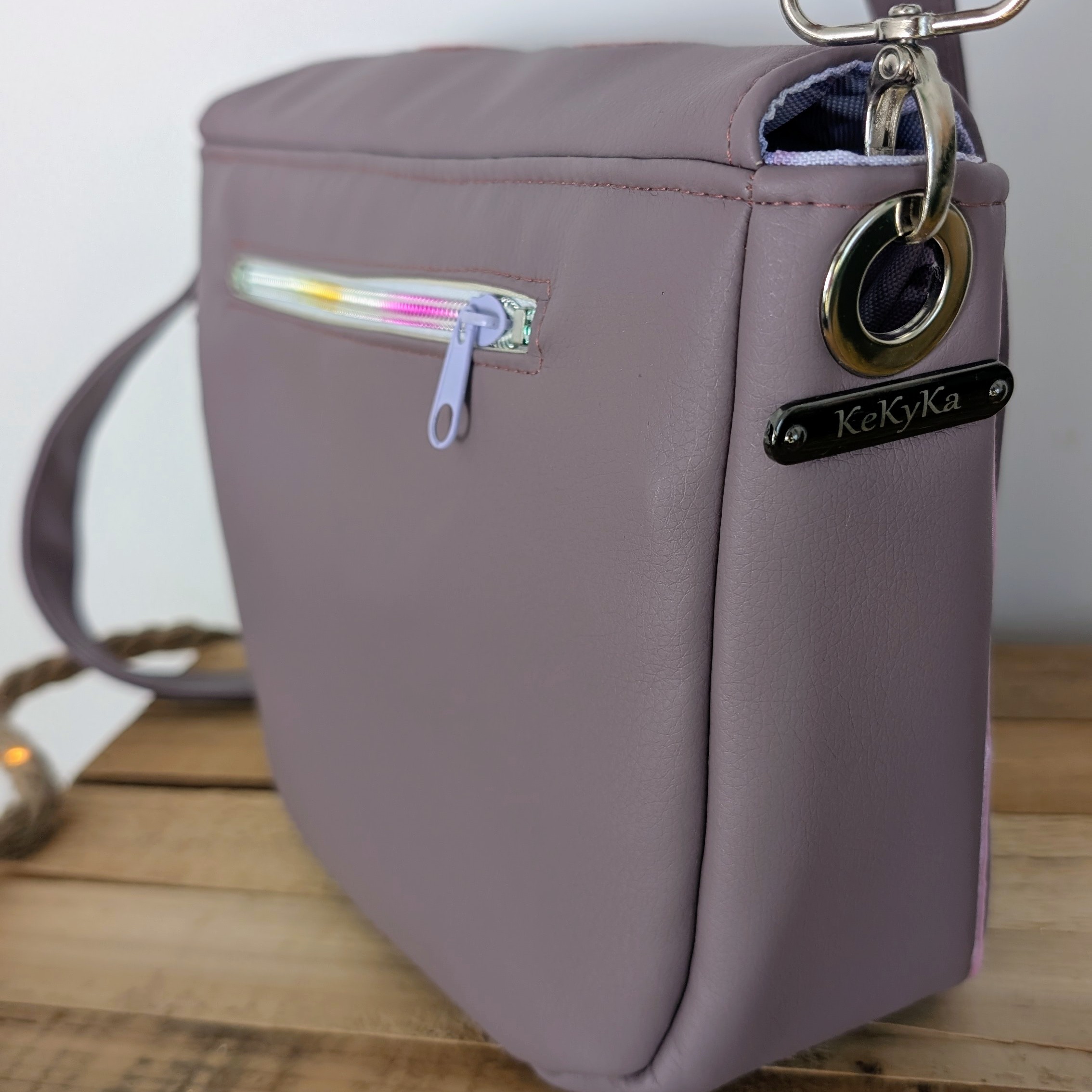 • Bandoulière en simili mauve assorti — amovible via mousquetons métal argenté, port épaule ou croisé