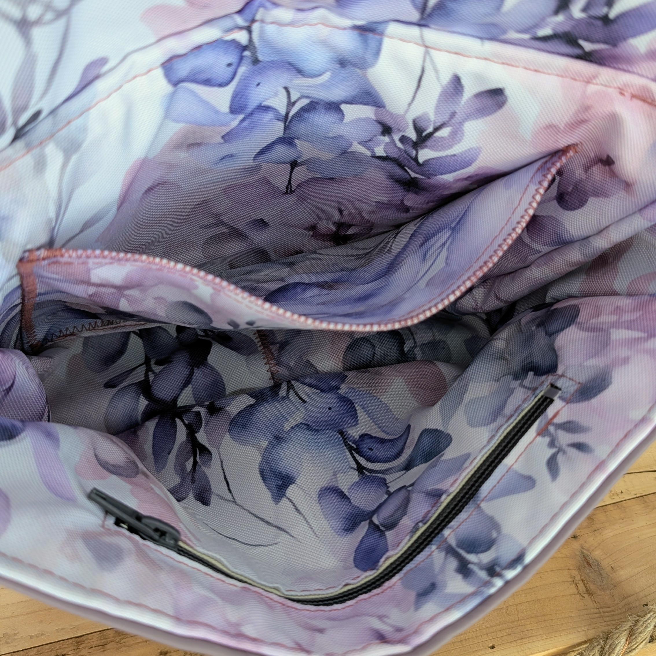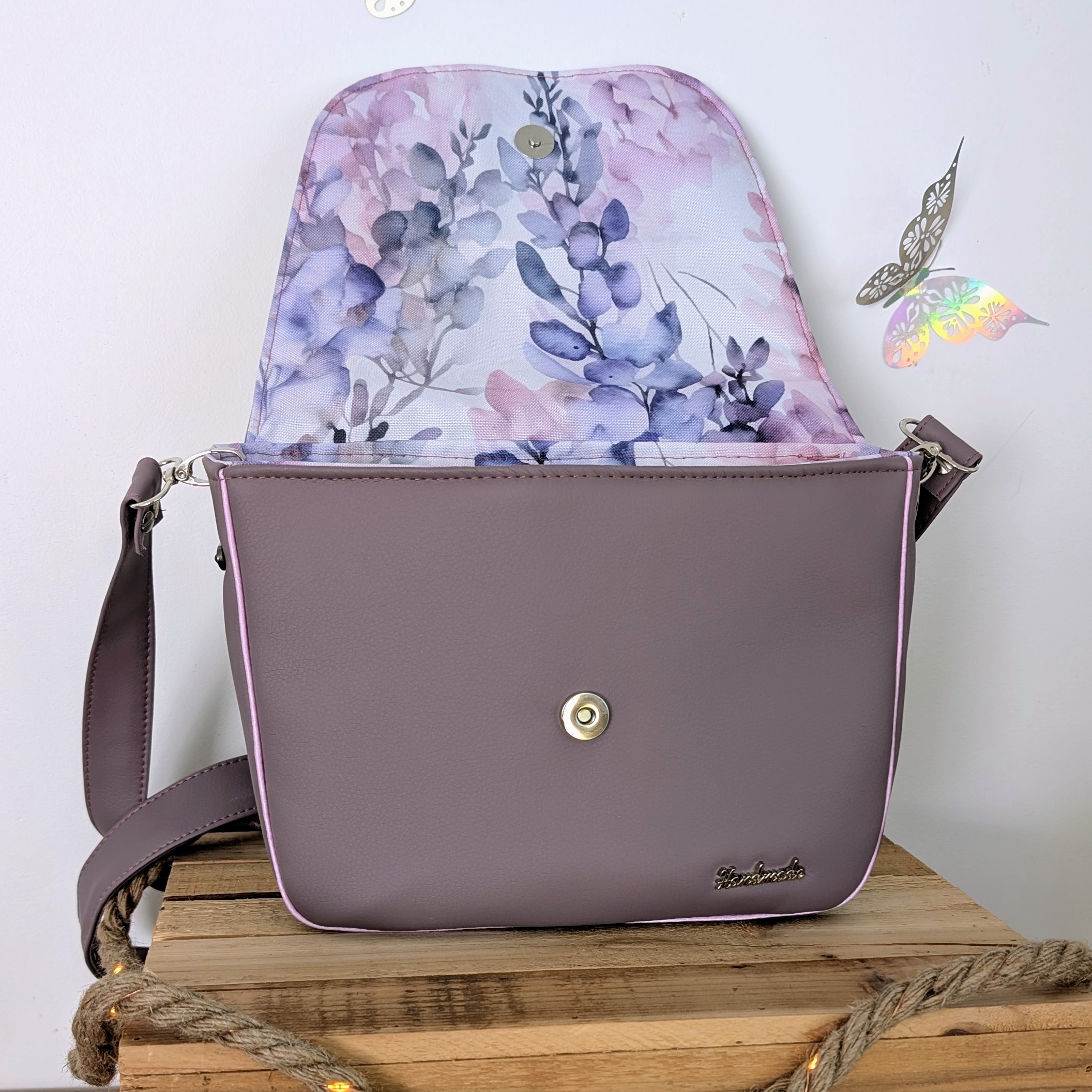 ✦ La surprise à l’ouverture… La doublure vous attend — un imprimé aquarelle floral lilas et violet, poétique et délicat, qui prolonge la magie de l’extérieur jusque dans les moindres recoins de ce sac.