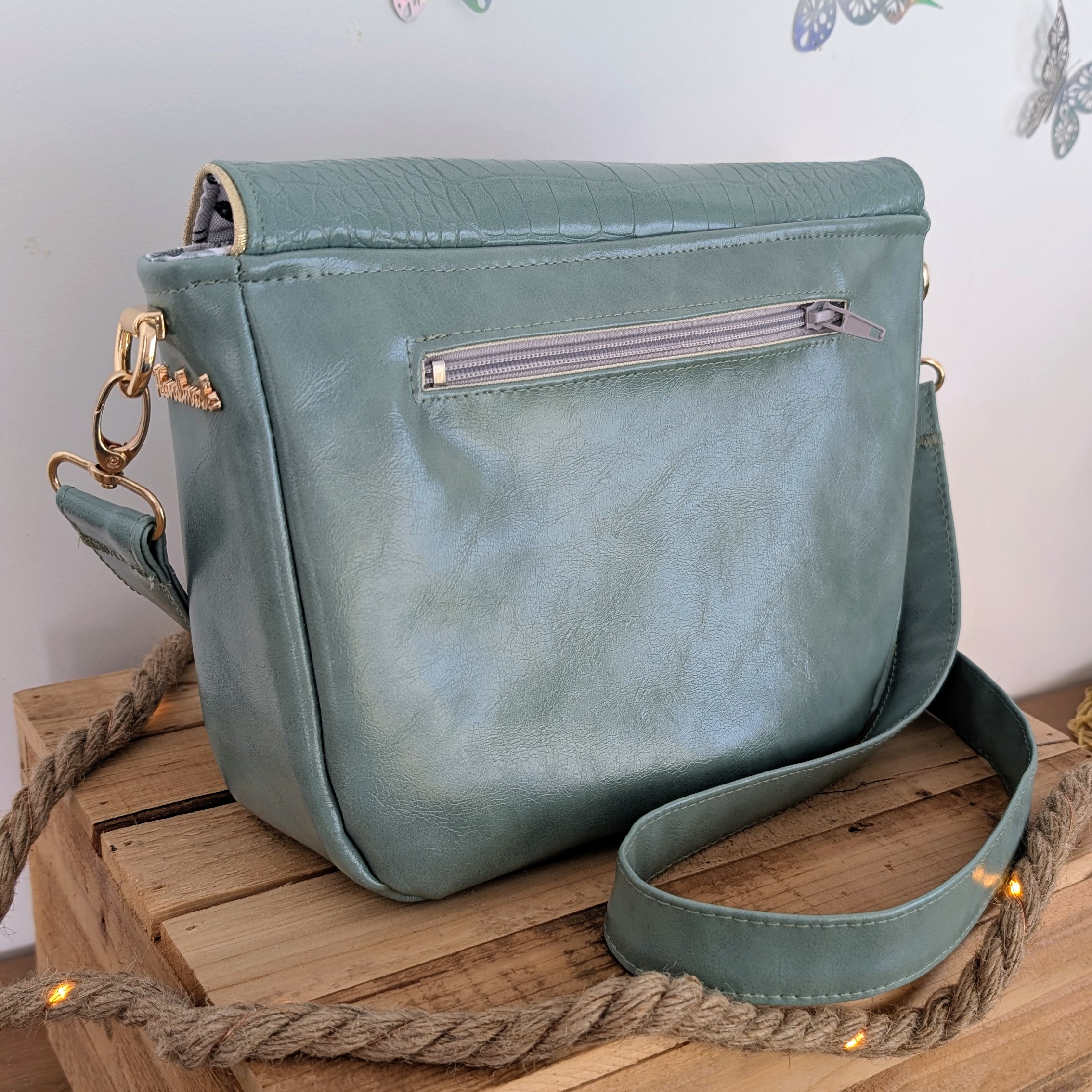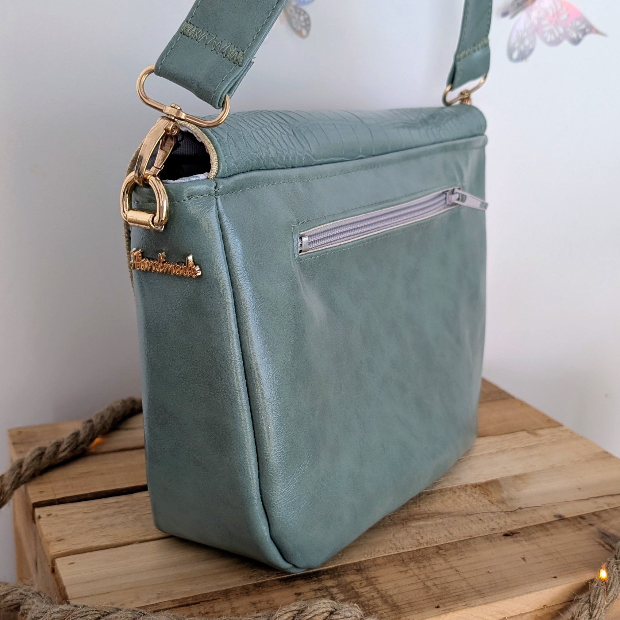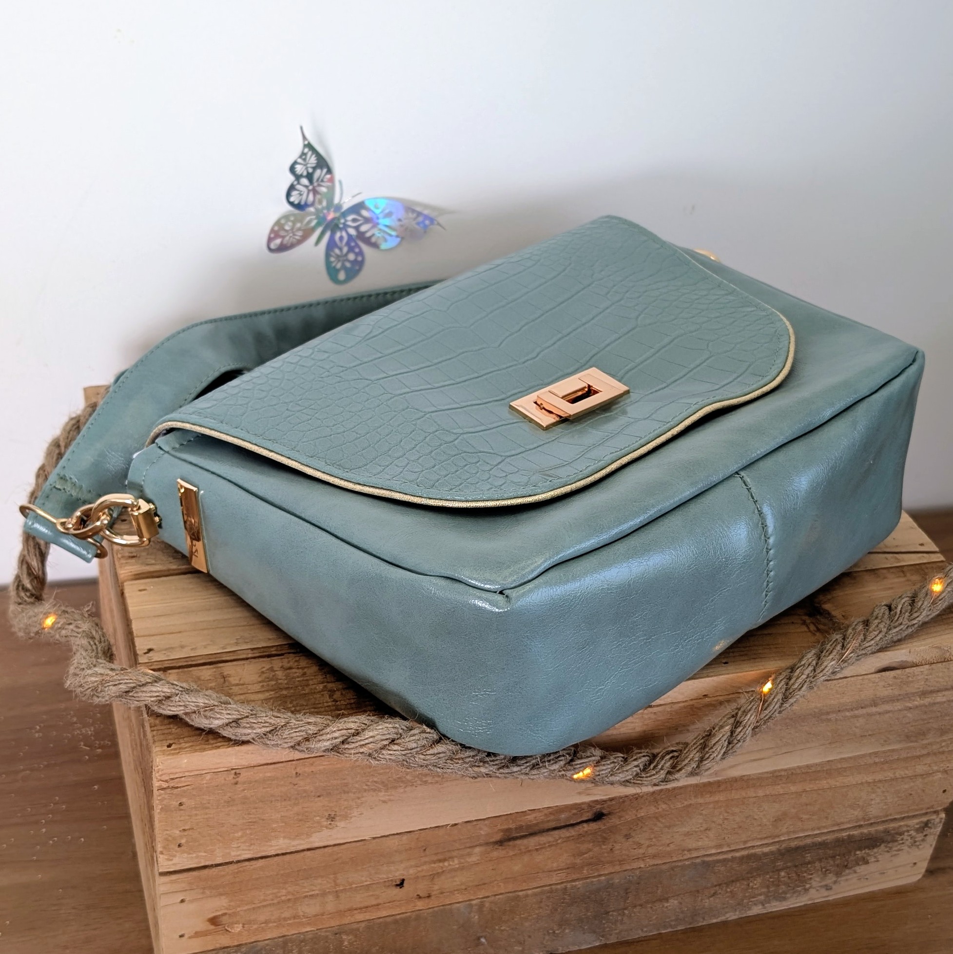 - ✦Bandoulière amovible en simili céladon assorti — mousquetons métal doré, port épaule ou croisé