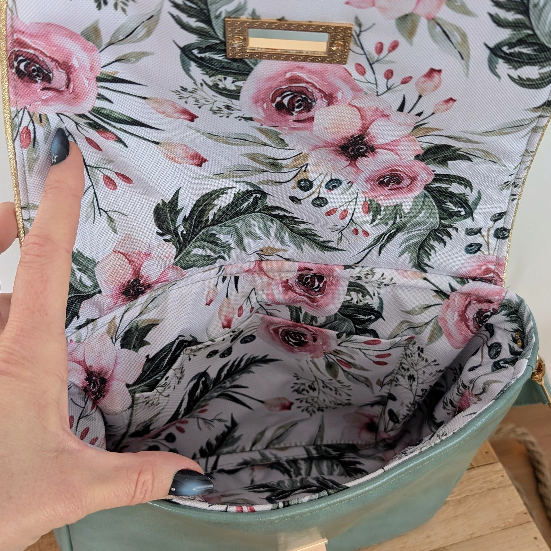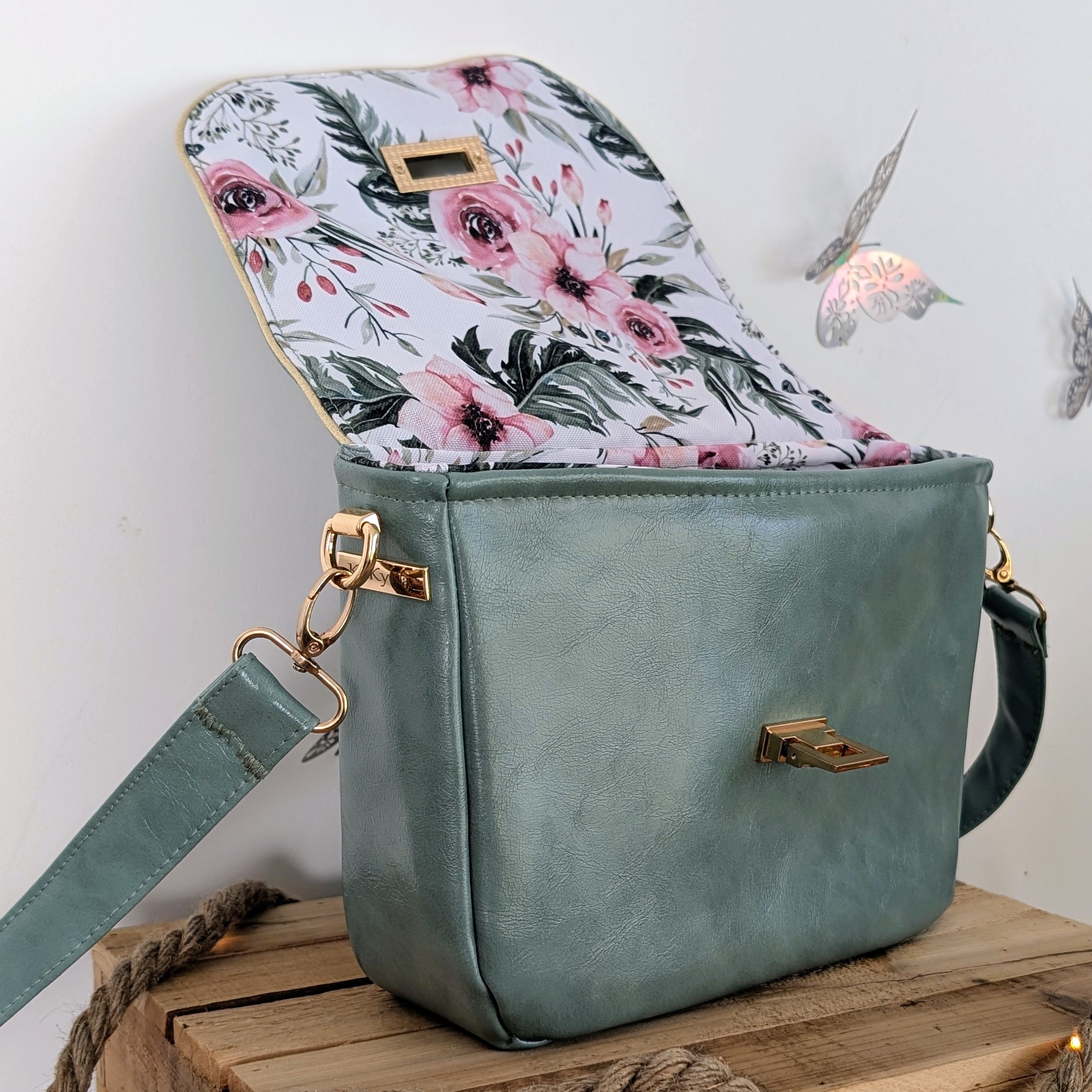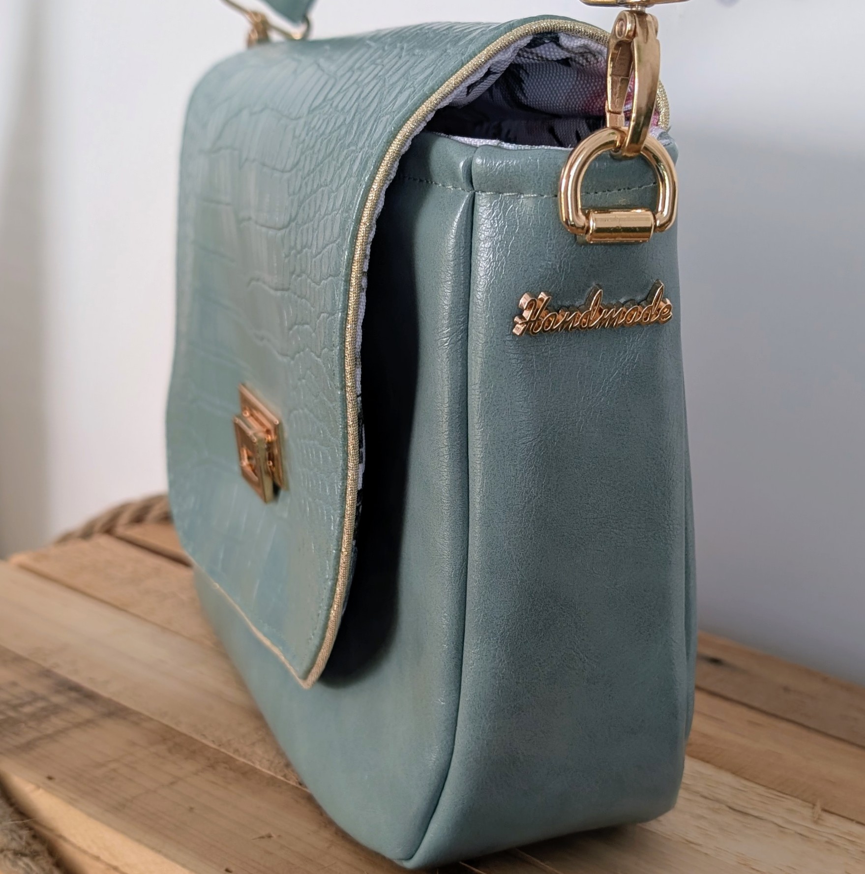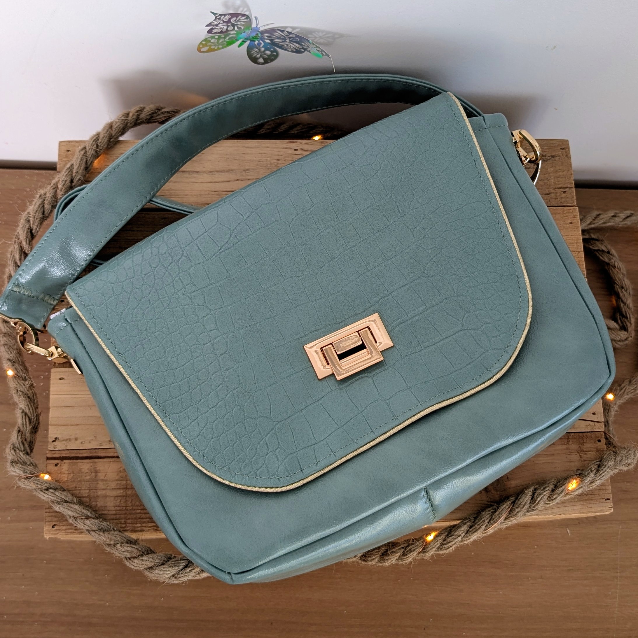- ✦Bandoulière amovible en simili céladon assorti — mousquetons métal doré, port épaule ou croisé