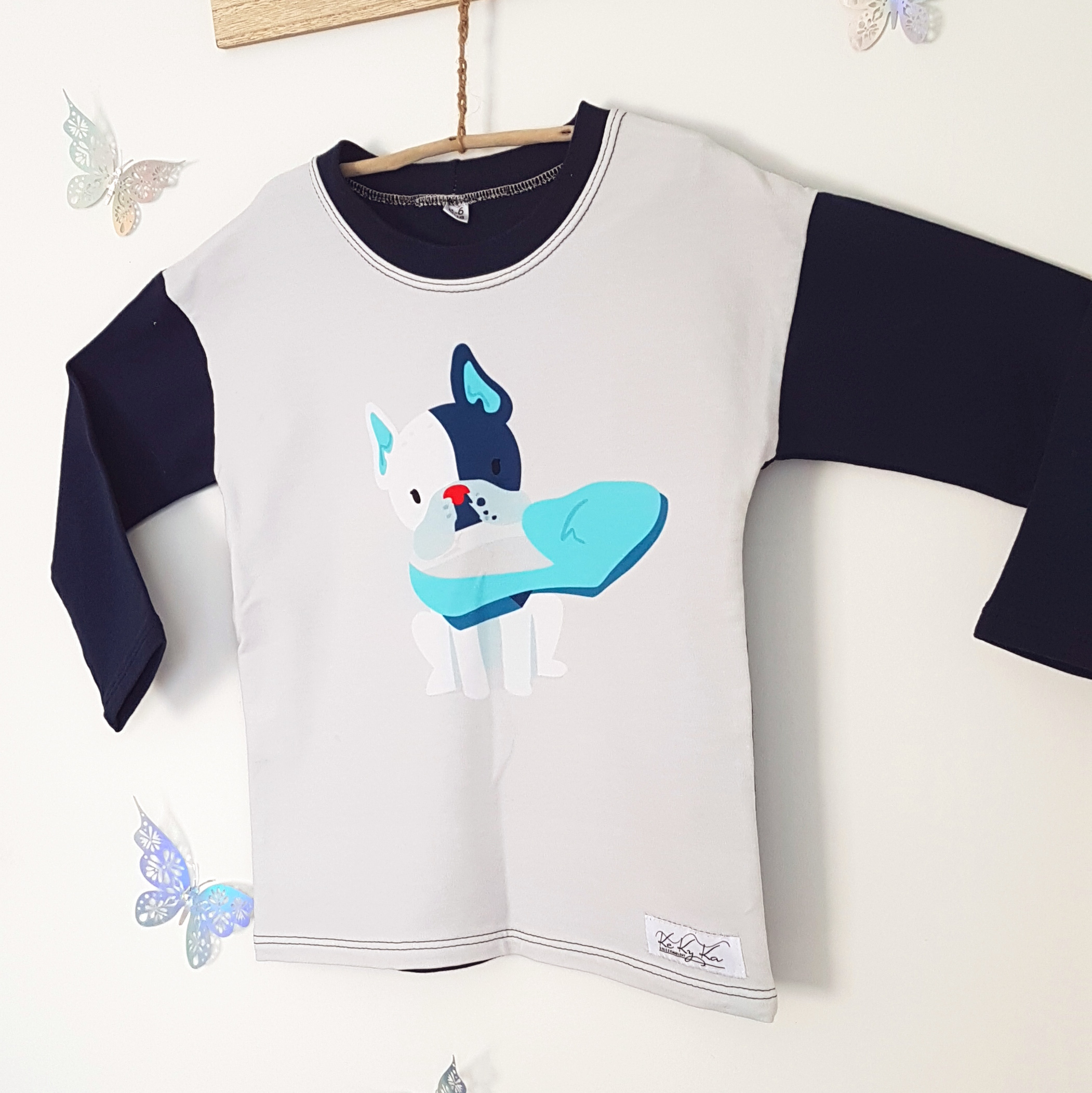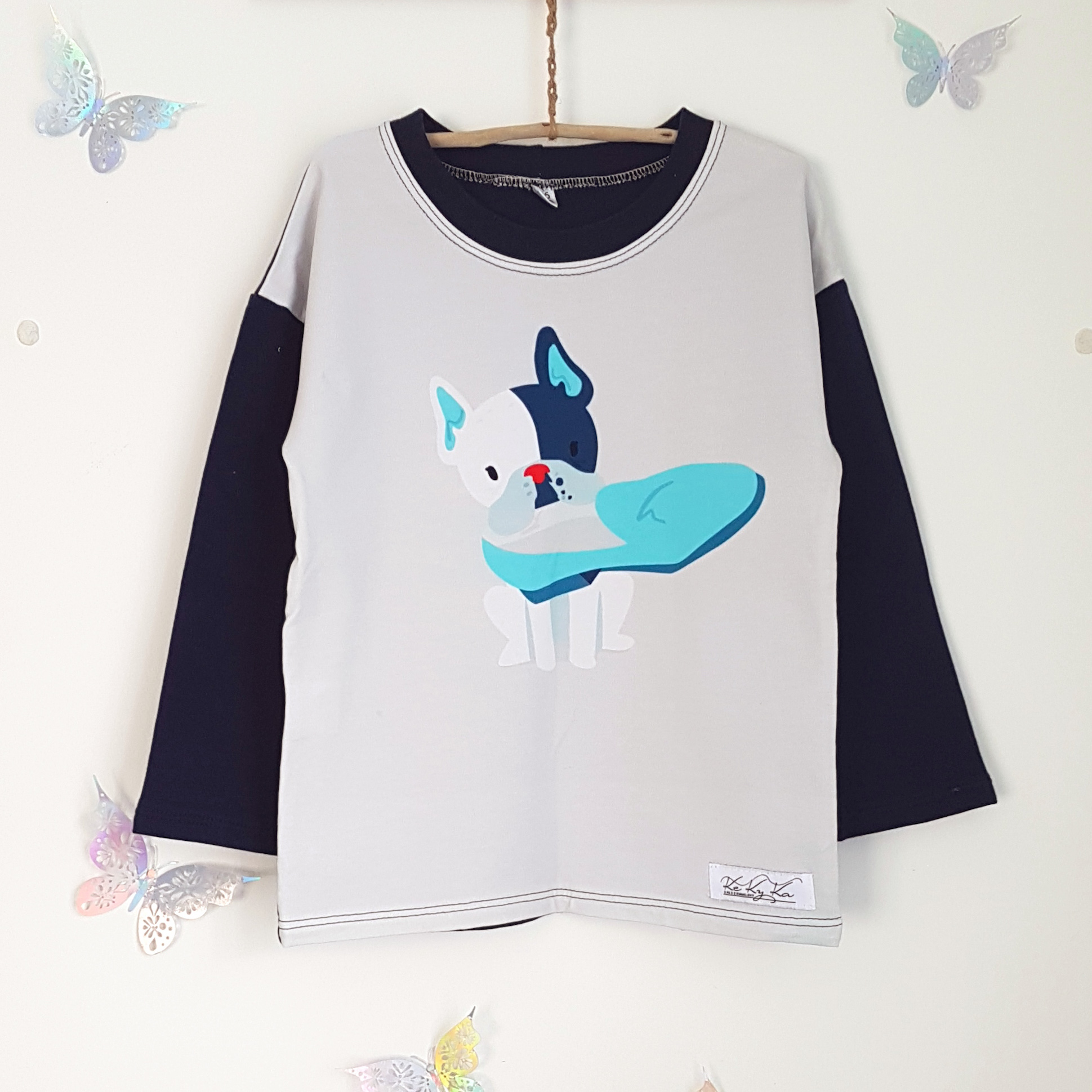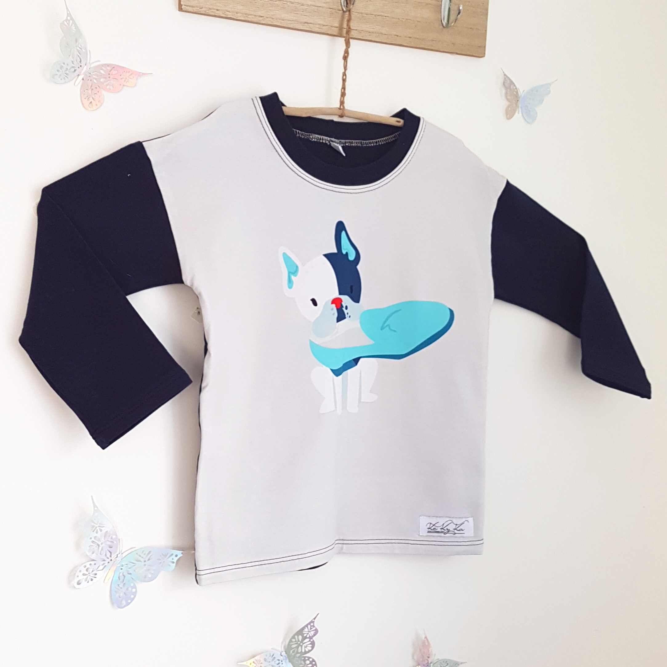 - ✦Bouledogue français imprimé sur le tissu — robe blanche et marine, oreilles bleu nuit, nez rouge vif. Un personnage tendre et graphique, plein de caractère