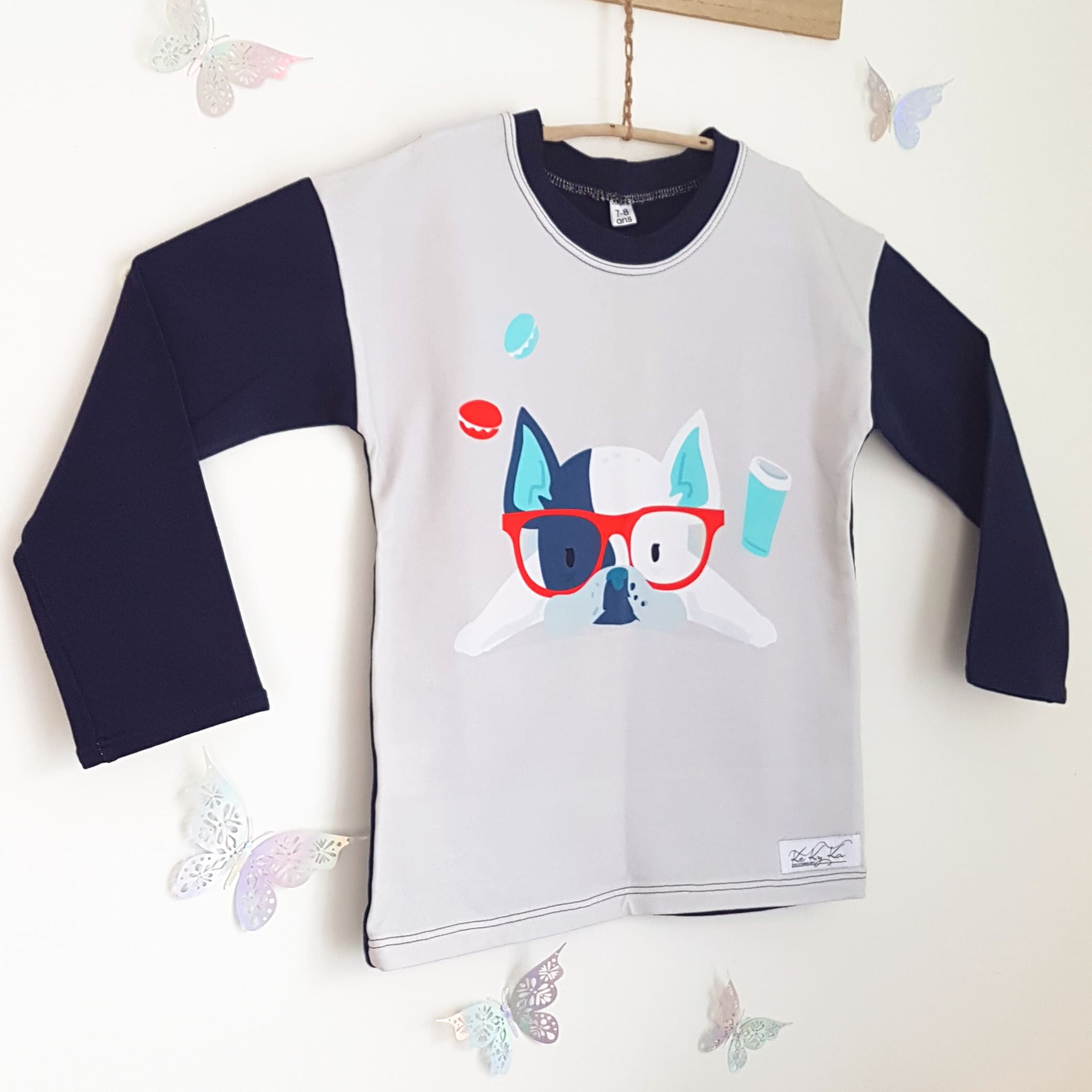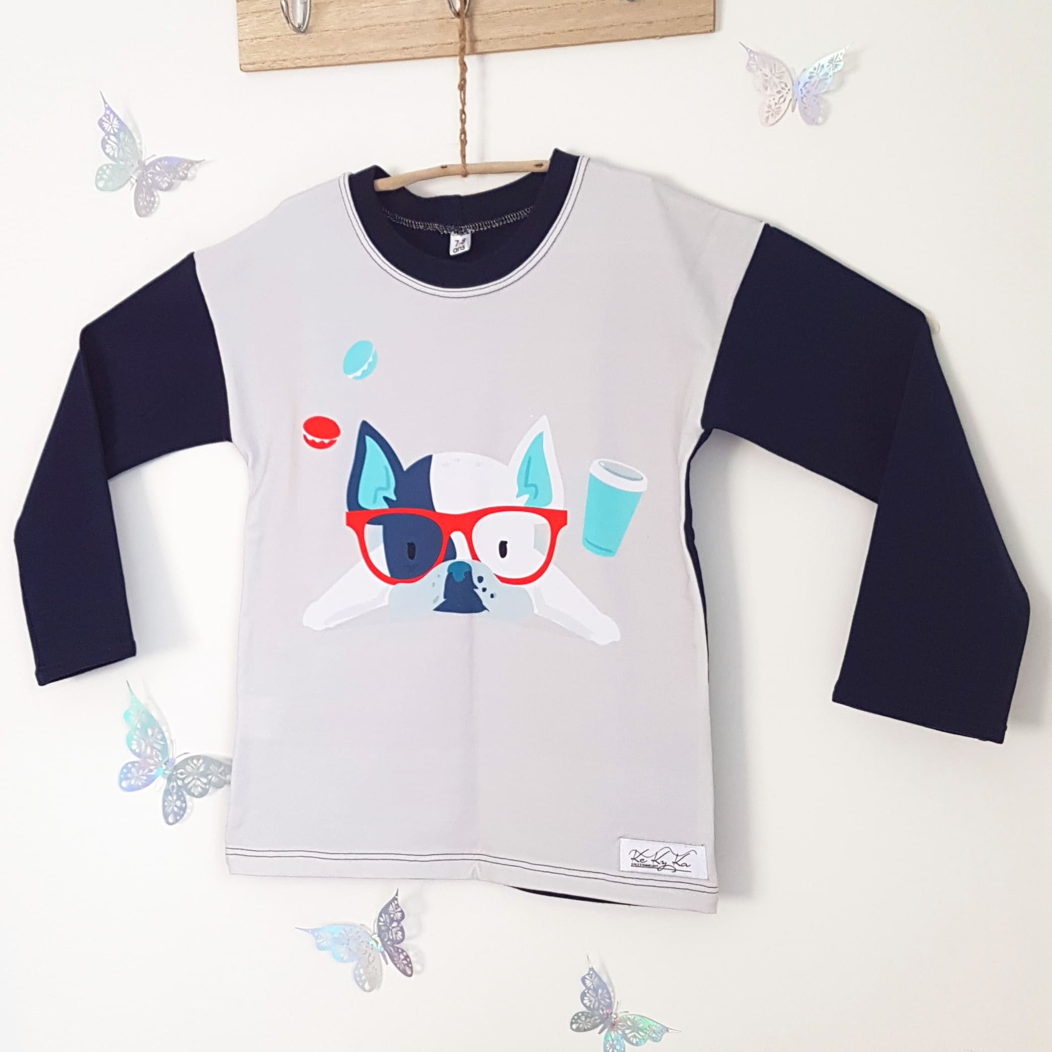 - ✦Bouledogue français imprimé sur le tissu — robe blanche et marine, grandes lunettes rouges iconiques. Un personnage posé, décontracté, qui regarde le monde avec style